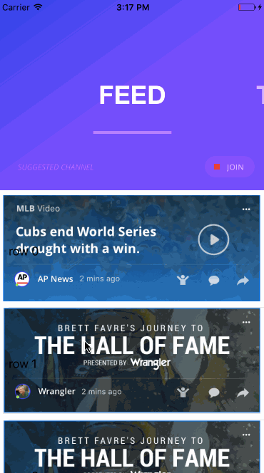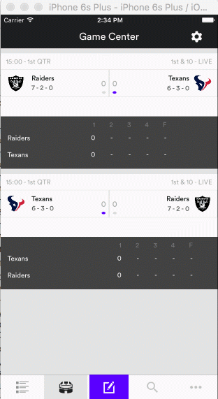 One major feature I worked on was Game Center, where sports fans can follow their favorite teams. Implementing Game Center was especially challenging due to the various frameworks involved, complex views and animations. It uses real time updates (websockets), embedded collectionViews within collectionViews within tableViews (inception!), stateless programming (RxSwift ftw), and a persistence layer (ty Realm). Just to get an idea of what I was working with, above is a brief gif debug session regarding an AutoLayout bug that was found.